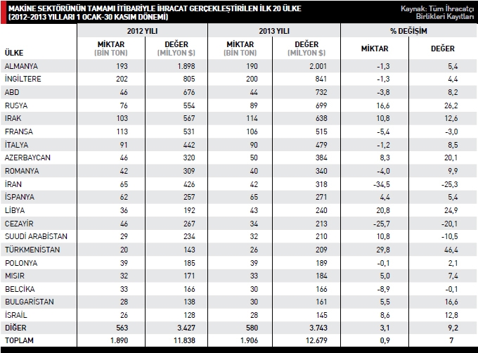 Isıtıcılar ve fırınlar ihracatı 2013 yılının Ocak-Kasım döneminde bir önceki yılın aynı dönemine göre yüzde 4,3 artış gösterdi. 2012 yılının Ocak-Kasım döneminde 267,7 milyon dolarlık ihracat gerçekleştiren sektörün, 2013 yılının aynı dönemindeki ihracatı 279,4 milyon dolar olarak kaydedildi. Isıtıcılar ve fırınlar ürün grubunda 2013 yılının Ocak-Kasım döneminde 28,3 milyon dolarla en fazla ihracat Almanya’ya gerçekleştirildi. Yüzde 5,7 artışın yaşandığı söz konusu ülkeye 2012 yılının aynı döneminde gönderilen ürünlerin değeri 26,8 dolardı. Listenin ikinci sırasında ise Rusya bulunuyor. Rusya’ya 2013 yılının Ocak-Kasım döneminde ihraç edilen ürünlerin değeri 20,7 milyon dolar olarak kaydedildi. Üçüncü sıradaki Azerbaycan’a 2013 yılının Ocak-Kasım döneminde ihraç edilen ürünlerin değeri 18 milyon dolar olarak kaydedildi. Yüzde 93,9 ihracat artışının yaşandığı söz konusu ülkeye, 2012 yılının aynı döneminde gönderilen ürünlerin değeri 9,2 milyon dolar seviyesindeydi. Listenin dördüncü ve beşinci sırasında ise Irak ve Fransa bulunuyor. Dördüncü sıradaki Irak’a 2012 yılı Ocak-Kasım döneminde gönderilen ürünlerin değeri 15 milyon dolarken bu rakam, yüzde 7,6 artışla 2013 yılının aynı döneminde 17,5 milyon dolar seviyesine yükseldi. Beşinci sıradaki Fransa’ya ise 2013 yılı Ocak- Kasım döneminde 15,1 milyon dolarlık ısıtıcılar ve fırınlar ihracatı gerçekleştirildi. Yüzde 0,9 ihracat artışı yaşanan sektörün 2012 yılının aynı dönemindeki ihracatı 15 milyon dolardı. Isıtıcılar ve fırınlar mal grubunda en fazla ihracat artışı yüzde 120,7 ile Suudi Arabistan’da yaşandı. Suudi Arabistan’ın ardından yüzde 93,9 ile