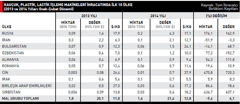 Kauçuk, plastik, lastik işleme makineleri aksam ve parçaları sektöründe 2014 yılının Ocak-Şubat döneminde 21,4 milyon dolar değerinde ihracat gerçekleştirildi. 2013 yılının aynı döneminde bu rakam 20,1 milyon dolardı. Kauçuk, plastik, lastik işleme makineleri aksam ve parçaları sektöründe ihracat artışı yüzde 6,1 olarak kaydedildi. Kauçuk, plastik, lastik işleme makineleri aksam ve parçaları mal grubunda 2014 yılının Ocak-Şubat döneminde en fazla ihracat 4,3 milyon dolarla Rusya’ya gerçekleştirildi. Yüzde 162,9 artışın yaşandığı söz konusu ülkeye 2013 yılının aynı döneminde gönderilen ürünlerin değeri 1,6 milyon dolardı. Listenin ikinci sırasında yer alan İran’a 2014 yılının Ocak-Şubat döneminde 2 milyon dolarlık ihracat gerçekleştirildi. Üçüncü sıradaki Bulgaristan’a 2014 yılının Ocak-Şubat döneminde 1,5 milyon dolar değerinde ürün ihraç edildi. 2013 yılında bu rakam 929 bin dolar seviyesindeydi. Bulgaristan’a yönelik ihracat artışı yüzde 68,7 oldu. Dördüncü sırada bulunan Özbekistan’a 2013 yılının Ocak-Şubat döneminde ihraç edilen ürünlerin değeri 481 bin dolarken bu rakam 2014 yılının aynı döneminde, yüzde 152,7 artışla 1,2 milyon dolar seviyesine yükseldi. Listenin beşinci sırasındaki Almanya’ya 2014 yılının Ocak-Şubat döneminde 986 bin dolar değerinde kauçuk, plastik, lastik işleme makineleri aksam ve parçaları ihraç edilirken 2013 yılının aynı döneminde bu rakam yüzde 465 bin dolar seviyesindeydi. Almanya’ya yönelik ihracat artışı yüzde 111,8 oldu. Kauçuk, plastik, lastik işleme makineleri aksam ve parçaları sektöründe ihracat artışının en fazla yaşandığı ülke yüzde 720,3 ile Çin oldu. Çin’in ardından ikinci sırada yüzde 607 ile Sırbistan ve üçüncü sırada ise yüzde 162,9 ihracat artışıyla Rusya bulunuyor.
