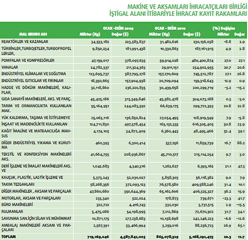 MAKİNE SEKTÖRÜ TOPLAMI 84. FASLIN TAMAMI VE 84. FASIL DIŞI ORTA ANADOLU MAKİNE VE AKSAMLARI İHRACATÇILARI BİRLİĞİ İŞTİGAL ALANI TOPLAMINDAN OLUŞAN MAKİNE SEKTÖRÜNÜN TAMAMININ İHRACATI 2010 YILININ OCAK-EKİM DÖNEMİNDE YÜZDE 13,9 ORANINDA ARTARAK 8 MİLYAR 192 MİLYON DOLARA YÜKSELDİ.