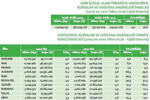Ülkemiz endüstriyel klima ve soğutmamakineleri ihracatı 2010 yılının Ocak-Ekim döneminde yükseliş kaydetti.Geçtiğimiz yılın Ocak-Ekim dönemi ilekarşılaştırıldığında değer bazında yüzde26,8 oranında yükselen endüstriyel klimave soğutma makineleri ihracatımız,miktar bazında ise yüzde 27,1 oranındaartış gösterdi. Değer olarak ise 2009 yılınınOcak-Ekim döneminde 587 milyon795 bin dolar olan endüstriyel klima vesoğutma makineleri ihracatımız 2010yılının Ocak-Ekim döneminde ise yüzde26,8 oranında artarak 745 milyon 512bin dolar oldu.Endüstriyel klima ve soğutma makineleriihracatımızın en fazla olduğuülke ise İngiltere. Söz konusu ülkeye2010 yılının Ocak-Ekim döneminde95 milyon 121 bin dolarlık endüstriyelklima ve soğutma makineleri ihracatıgerçekleştirildi. Bu mal grubu içerisindekien büyük ikinci ihracat pazarımızınise Irak olduğu görülüyor. Irak’a 2009yılının Ocak-Ekim döneminde 48 milyon362 bin dolarlık endüstriyel klima vesoğutma makineleri ihracatımız sözkonusu iken 2010 yılının aynı döneminegelindiğinde ise bu değer yüzde 13 oranındaartış kaydederek 54 milyon 634bin dolar ihracat düzeyini yakalandı. Endüstriyelklima ve soğutma makineleriihracatımızın üçüncü en büyük ihracatpazarı ise Fransa oldu. Fransa’ya 2009yılının Ocak-Ekim döneminde 46 milyon178 bin dolarlık endüstriyel klima ve soğutma makineleri ihracatı yapılırken,yüzde 4,5 gibi bir artışla, ihracatımız 48milyon 257 bin dolara yükseldi.Endüstriyel klima ve soğutma makineleriihracatımızın 2010 yılı Ocak-Ekimdöneminde en fazla artış gösterdiğiülkenin ise Cezayir olduğu görülüyor.Söz konusu ülkeye 2009 yılının Ocak-Ekim döneminde 7 milyon 748 bindolarlık endüstriyel klima ve soğutmamakineleri ihracatımız söz konusu iken2010 yılının aynı dönemine gelindiğindeise bu değer yüzde 182,2 oranında artışkaydederek 21 milyon 864 bin dolarihracat düzeyini yakaladı.Endüstriyel klima ve soğutma makineleriihracatımızda bir diğer önemliyükseliş ise yüzde 95 değer artışı ileİran ile yaşanmıştır. Söz konusu ülkeye2009 yılının Ocak-Ekim döneminde18 milyon 962 bin dolarlık endüstriyelklima ve soğutma makineleri ihracatıgerçekleştirilirken, bu rakam 2010 yılınınaynı döneminde 36 milyon 967 bindolara ulaştı.Bu mal grubu içerisindeki diğer büyükihracat artışının yaşandığı ülkenin iseRusya olduğu görülüyor. Rusya’ya2009 yılının Ocak-Ekim döneminde14 milyon 902 bin dolarlık endüstriyelklima ve soğutma makineleri ihracatımızsöz konusu iken 2010 yılının aynıdönemine gelindiğinde ise bu değeryüzde 51,4 oranında artış kaydederek22 milyon 556 bin dolar ihracatdüzeyini yakaladı. Endüstriyel klimave soğutma makineleri ihracatımızdaartış yaşanan ülkelerden bir diğeriise İtalya oldu. İtalya’ya 2009 yılınınOcak-Ekim döneminde 13 milyon353 bin dolarlık endüstriyel klima vesoğutma makineleri ihracatı yapılırken,2010 yılının aynı döneminde burakam yüzde 53,1 artış kaydederek20 milyon 449 bin dolar seviyesineyükseldi.