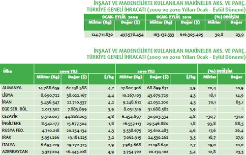 İMakine ve aksamları ihracatımızın enönemli kalemlerinden biri olan inşaatve madencilik makineleri ihracatımız2010 yılının Ocak-Ekim dönemindeyükseliş kaydetti. Geçtiğimiz yılınOcak-Ekim dönemi ile karşılaştırıldığındadeğer bazında yüzde 23,9oranında yükselen inşaat ve madencilikmakineleri ihracatımız, miktarbazında ise yüzde 30,8 oranında artışgösterdi. Değer olarak ise 2009 yılınınOcak-Ekim döneminde 497 milyon578 bin dolar olan inşaat ve madencilikmakineleri ihracatımız 2010 yılınınOcak-Ekim döneminde ise yüzde 23,9oranında artarak 616 milyon 305 bindolar oldu.İnşaat ve madencilik makineleriihracatımızın en fazla olduğu ülke iseAlmanya. Söz konusu ülkeye 2010yılının Ocak-Ekim döneminde 68 milyon899 bin dolarlık inşaat ve madencilikmakineleri ihracatı gerçekleştirildi. Bumal grubu içerisindeki en büyük ikinciihracat pazarımızın ise Libya olduğu görülüyor.Libya’ya 2009 yılının Ocak-Ekimdöneminde 38 milyon 22 bin dolarlıkinşaat ve madencilik makineleri ihracatımızsöz konusu iken 2010 yılının aynıdönemine gelindiğinde ise bu değeryüzde 14,9 oranında artış kaydederek43 milyon 679 bin dolar ihracat düzeyiyakalandı. İnşaat ve madencilik makineleriihracatımızın üçüncü en büyükihracat pazarı ise İran oldu. İran’a 2009 yılının Ocak-Ekim döneminde 22 milyon710 bin dolarlık inşaat ve madencilikmakineleri ihracatı yapılırken, yüzde85,1 gibi önemli bir artışla, ihracatımız42 milyon 32 bin dolara yükseldi.İnşaat ve madencilik makineleriihracatımızın 2010 yılı Ocak-Ekimdöneminde en fazla artış gösterdiğiülkelerden bir diğerinin ise İngiltereolduğu görülüyor. Söz konusu ülkeye2009 yılının Ocak-Ekim döneminde15 milyon 677 bin dolarlık inşaat vemadencilik makineleri ihracatımız sözkonusu iken 2010 yılının aynı döneminegelindiğinde ise bu değer yüzde88,5 oranında artış kaydederek 29milyon 546 bin dolar ihracat düzeyiniyakaladı.İnşaat ve madencilik makineleri ihracatımızdabir diğer önemli yükseliş iseyüzde 23,3 değer artışı ile Azerbaycanile yaşanmıştır. Söz konusu ülkeye 2009yılının Ocak-Ekim döneminde 16 milyon445 bin dolarlık inşaat ve madencilikmakineleri ihracatı gerçekleştirilirken, burakam 2010 yılının aynı döneminde 20milyon 274 bin dolara ulaştı.Bu mal grubu içerisindeki diğer büyükihracat artışının yaşandığı ülkenin iseIrak olduğu görülüyor. Irak’a 2009 yılınınOcak-Ekim döneminde 19 milyon181 bin dolarlık inşaat ve madencilikmakineleri ihracatımız söz konusu iken2010 yılının aynı dönemine gelindiğindeise yüzde 27,9 oranında değer artışıkaydederek 24 milyon 530 bin dolarihracat düzeyini yakalandı. İnşaat vemadencilik makineleri ihracatımızdaartış yaşanan ülkelerden bir diğeriise İtalya oldu. İtalya’ya 2009 yılınınOcak-Ekim döneminde 19 milyon 272bin dolarlık inşaat ve madencilik makineleriihracatı yapılırken, 2010 yılınınaynı döneminde bu rakam yüzde 10artış kaydederek 21 milyon 198 bindolar seviyesine yükseldi.