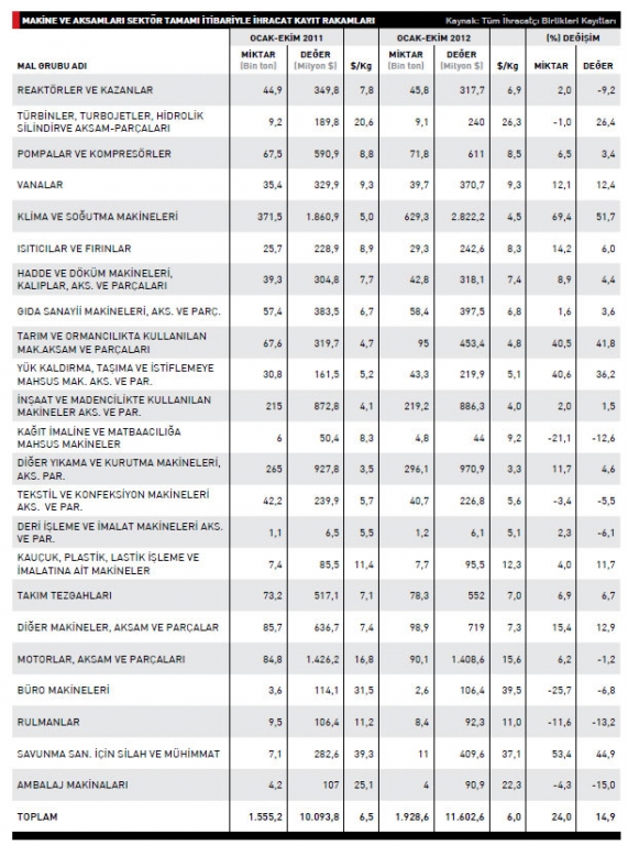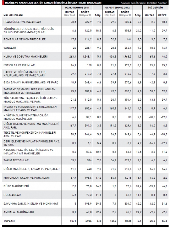 Makine ve aksamları sektörü ihracatımız 2012 yılı Ocak-Temmuz döneminde geçtiğimiz yıla oranla yüzde 16,5 oranında artış gösterdi. 2011 yılının Ocak-Temmuz döneminde 6 milyar 986 milyon dolar olan ihracat değeri 2012 yılının aynı ayları arasında 8 milyar136 milyon dolar seviyesine yükseldi.Makine ve aksamları sektöründeihracat gerçekleştirilen ilk 20 ülkesıralamasında yer alan Almanya, bu yılın Ocak-Haziran döneminde en fazlamakine ihraç ettiğimiz ülke oldu. 2011yılı Ocak-Temmuz ayları arasında 1milyar 79 milyon dolar değerinde ürünihraç edilen bu ülkeye, 2012 yılının aynı döneminde 1 milyar 282 milyon dolarlık ihracat gerçekleştirildi.