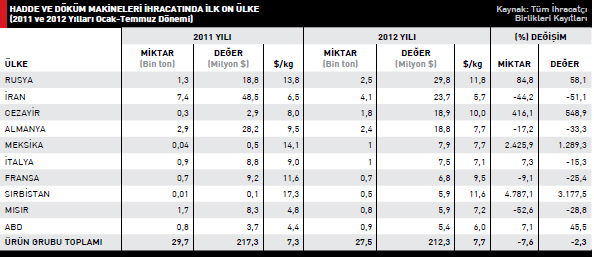 değerinde ürün ihraç edildi.Makine sektörünün önemli alt sektörlerinden biri olan hadde ve döküm makineleri, kalıplar, aksam ve parçaları sektöründe 2012 yılının Ocak-Temmuz döneminde en fazla ihracat Rusya’ya yapıldı.