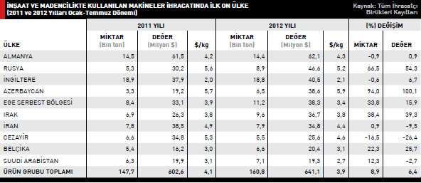 2011 yılı Ocak-Temmuz döneminde 602 milyon 654 bin dolar değerinde ürün ihraç edilen inşaat ve madencilikte kullanılan