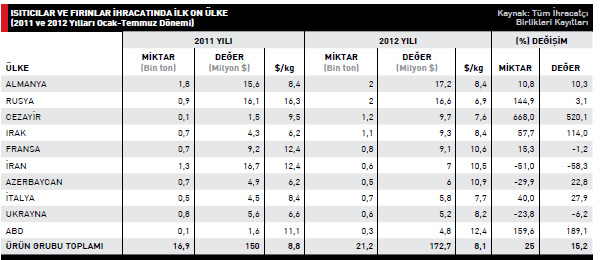 Yüzde 15,2 oranında artış gösteren ısıtıcılar ve fırınlar sektörü 2011 yılının Ocak-Temmuz ayları arasında 150 milyon 7 bin dolar tutarındaki ihracat değerinden, 2012 yılının aynı döneminde172 milyon 736 bin dolar rakamına yükseldi.