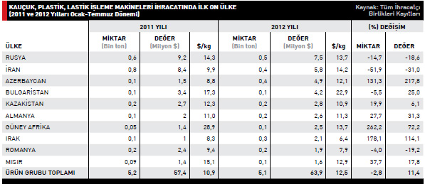 Makine sektörünün önemli alt ürün gruplarından biri olan kauçuk, plastik,lastik işleme ve imalatına ait makineler ürün grubunda 2012 yılı Ocak-Temmuz döneminde en fazla ihracat gerçekleştirilen ülke 7 milyon 545 bin dolarla Rusya oldu.