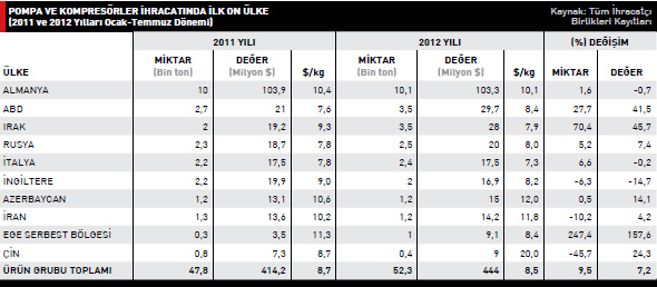 Temmuz döneminde 414 milyon 249 bin dolar değerinde ihracat gerçekleştirildi. 2012 yılının aynı dönemindeise bu rakam 444 milyon 59 bindolara yükseldi.2012 yılının Ocak-Temmuz döneminde pompa ve kompresörler kaleminde enfazla ürün ihraç edilen ülke 103 milyon302 bin dolarla Almanya oldu.