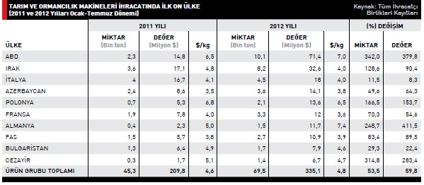 Tarım ve ormancılıkta kullanılan makineler aksam ve parçaları sektöründe 2012 yılı Ocak-Temmuz döneminde 335milyon 196 bin dolar değerinde ürün ihraç edildi. Yüzde 59,8 oranında artışınyaşandığı söz konusu sektörün 2011yılı aynı döneminde ihraç ettiği makineaksam ve parçalarının toplam değeri209 milyon 801 bin dolardı.