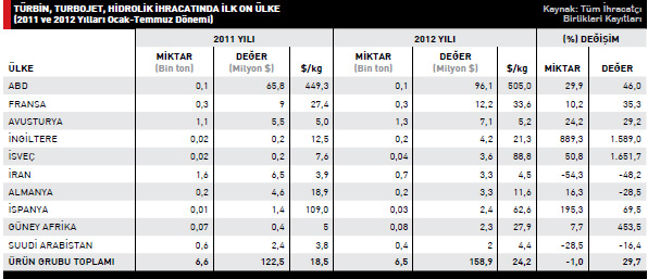 Türbin, turbojet, hidrolik silindiraksamları ve parçaları ihracatıkaleminde en fazla ürün gönderilenülke 96 milyon 112 bin dolarile ABD oldu. Bu rakam 2011yılının Ocak-Temmuz döneminde 65 milyon 811 bin dolar olarak belirlendi.