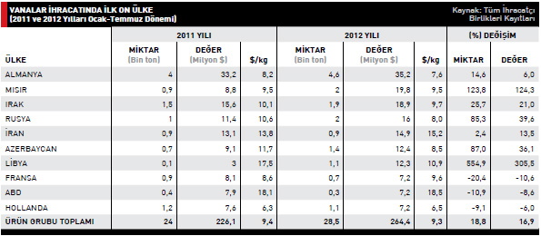 Almanya’ya yönelik ihracatımız yüzde 6oranında arttı. Listenin ikinci sırasındayer alan Mısır’a yapılan ihracat yüzde124,3 oranında artarak 2012 yılı Ocak-Temmuz ayları arasında 19 milyon 850 bin dolara ulaştı. 2011 yılının aynı döneminde bu rakam 8 milyon 850 bindolar seviyesindeydi.