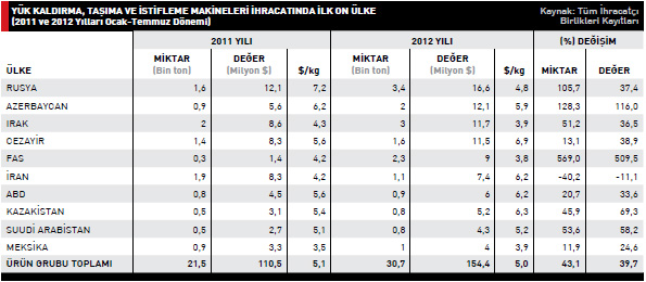 Listenin ikinci sırasında bulunan Azerbaycan’a 2011yılının Ocak-Temmuz ayları arasında 5milyon 616 bin dolar değerinde ihracat yapılırken bu rakam 2012 yılının aynı ayları döneminde 12 milyon 132 bin dolar seviyesine yükseldi. Azerbaycan’a yönelik ihracat artış oranı yüzde 116olarak saptandı. Üçüncü sıradaki Irak’a gerçekleştirilen ihracatın değeri 2012 yılı Ocak-Temmuz döneminde 11milyon 772 bin dolar olurken geçtiğimiz yılın aynı döneminde bu rakam 8milyon 621 bin dolardı. Irak’a yönelik yük kaldırma, taşıma ve istiflemeye mahsus makine aksam ve parçaları ihracatı artışı yüzde 36,5 oranında kaydedildi.