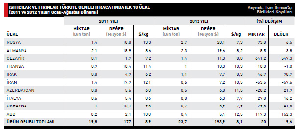 Isıtıcılar ve fırınlar ürün grubunda enfazla ihracat yapılan ülke yüzde 6,5artışla Rusya oldu. 2011 yılının Ocak-Ağustos döneminde 18,8 milyon dolar değerinde ürün ihraç edilen söz konusu ülkeye 2012 yılının aynı döneminde gönderilen ürün tutarı 20,1 milyon dolara yükseldi. İkinci sırada bulunan Almanya’ya yönelik ihracat artışı yüzde3,8 olurken 2012 yılı Ocak-Ağustos döneminde gerçekleştirilen ihracatın değeri 19,6 milyon dolar olarak kayda geçti.