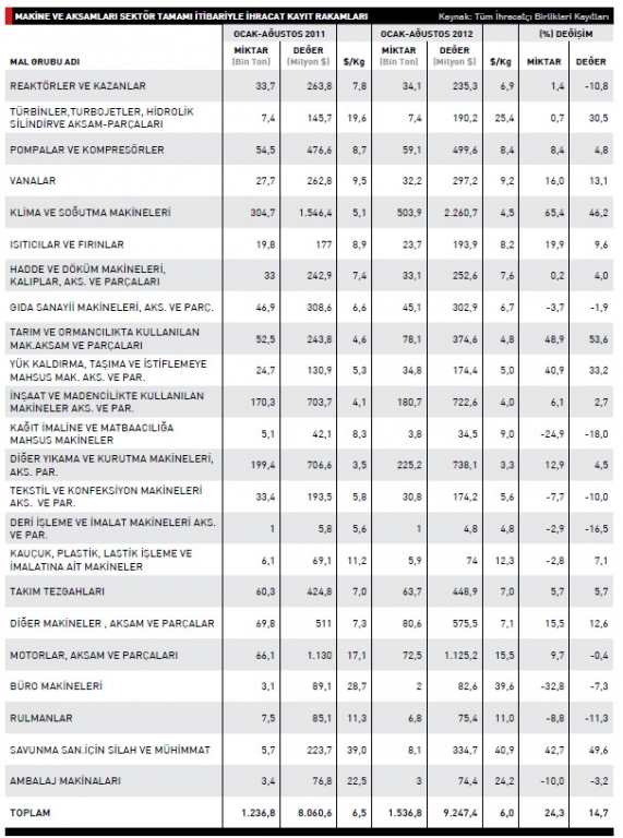 2011 yılı Ocak-Ağustos döneminde8 milyar dolar olan makine ve aksamları sektörü ihracatımız yüzde14,7 artışla 2012 yılının aynı ayları arasında 9,2 milyar dolar seviyesine yükseldi.