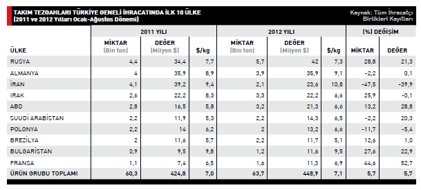 2012 yılı Ocak-Ağustos ayları arasındaki dönemde ABD’ye 78,5 milyon dolarlık ürün gönderilirken 2011 yılının aynıdöneminde bu rakam 19,8 milyondolar seviyesindeydi. Listenin ikinci sırasında bulunan Irak’a 2011 yılınınOcak-Ağustos döneminde 20,9 milyondolar değerinde ürün gönderilirken burakam yüzde 82,1 artışla 2012 yılınınaynı döneminde 38,1 milyon dolar seviyesine çıktı. Üçüncü sırada yer alanİtalya’ya 2012 yılı Ocak-Ağustos aylarıarasında yapılan ihracatın değeri 20,1milyon dolar olarak saptandı. Yüzde11,1 artışın yaşandığı İtalya’ya yönelikihracat, 2011 yılının aynı döneminde18,1 milyon dolar düzeyindeydi.