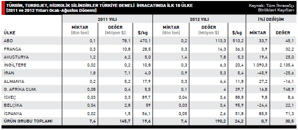 Türbin, turbojet, hidrolik silindir aksam ve parçaları ihracatı 2012 yılının Ocak-Ağustos ayları arasında bir önceki yılınaynı dönemine göre yüzde 30,5 arttı.2011 yılının Ocak-Ağustos döneminde145,7 milyon dolar değerinde ihracat gerçekleştirilirken 2012 yılının aynı döneminde bu rakam 190,2 milyon dolar seviyesine ulaştı.