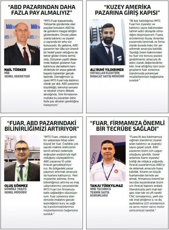 Kuzey Amerika’nın en önemli üretim teknolojileri fuarı olarak nitelendirilen IMTS Fuarı uzman ziyaretçilerin yoğunluğuyla dikkat çekerken, Türkiye’nin Makinecileri de dünyanın en önemli makine ithalatçısı olan ABD pazarında fuarla eşzamanlı olarak gerçekleştirdiği tanıtım-reklam faaliyetleri, toplantılar ve çeşitli görüşmelerle etkin bir çalışmaya imza attı.