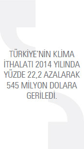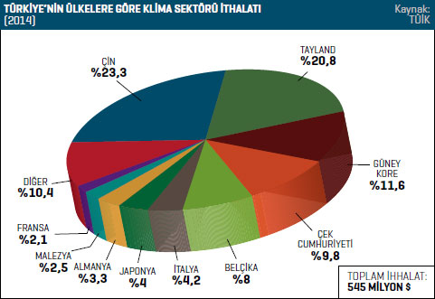 Türkiye’nin klima sektörü ithalatı 2013 yılında 700,4 milyon dolarken bu rakam, 2014 yılında yüzde 22,2 azalarak 545 milyon dolar olarak kaydedildi. Türkiye 2014 yılında 127 milyon dolarla en fazla Çin’den klima ithal etti. 2013 yılında söz konusu ülkeden gerçekleştirilen ithalatın değeri 210,7 milyon dolardı. Türkiye’nin 2014 yılında Çin’den gerçekleştirdiği ithalat yüzde 39,7 azaldı. Listenin ikinci sırasında bulunan Tayland’dan 2013 yılında 133,1 milyon dolarlık klima ithal edilirken bu rakam, 2014 yılında yüzde 15 azalarak 113,1 milyon dolar olarak kaydedildi. Üçüncü sırada bulunan Güney Kore’den 2014 yılında 63,1 milyon dolar değerinde klima ithal edildi. 2013 yılında Türkiye’nin söz konusu ülkeden gerçekleştirdiği klima ithalatı 79,2 milyon dolardı. 2014 yılında Türkiye’nin Güney Kore’den gerçekleştirdiği klima ithalatı yüzde 20,4 azaldı. Türkiye’nin 2014 yılında klima ithalatını en fazla artırdığı ülke yüzde 4,6 ile Çek Cumhuriyeti oldu. Söz konusu ülkeden 2013 yılında 51,3 milyon dolar değerinde klima ithal edilirken 2014 yılında bu rakam 53,6 milyon dolar değerine yükseldi. Türkiye 2014 yılında en fazla klima cihazlarının aksam- parçaları kaleminde ithalat gerçekleştirdi. Söz konusu ürün grubunda 2013 yılında 278,6 milyon dolarlık ithalat gerçekleştirilirken bu rakam 2014 yılında, yüzde 0,6 azalarak 277 milyon dolar oldu. Listenin ikinci sırasında bulunan pencere/duvar tipi klimalar (tek bir gövde halinde) kaleminde 2014 yılında 94,3 milyon dolar değerinde ithalat gerçekleştirildi. 2013 yılında bu rakam 247,1 milyon dolardı. Pencere/duvar tipi klimalar (tek bir gövde halinde) ürün grubundaki ithalat yüzde 61,8 azaldı. Listenin üçüncü sırasındaki bir soğutucu ünite ve soğutma/ısıtma çevrimli klimalar kaleminde 2013 yılında 91,4 milyon dolar değerinde ithalat gerçekleştirilirken bu rakam 2014 yılında yüzde 15,5 azalarak 76,3 milyon dolar seviyesinde kaydedildi.