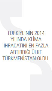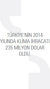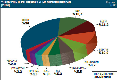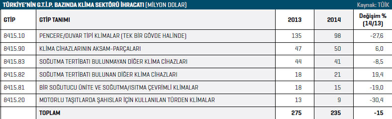 TÜİK verilerine göre Türkiye’nin klima sektörü ihracatı 2014 yılında, bir önceki yıla oranla yüzde 15 azalarak 235 milyon dolar olarak kaydedildi. 2013 yılında bu rakam 275 milyon dolardı. Türkiye 2014 yılında en fazla Irak’a klima ihracatı gerçekleştirdi. 2013 yılında Irak’a 30,9 milyon dolarlık ihracat gerçekleştirilirken bu rakam, 2014 yılında yüzde 2,7 artarak 31,8 milyon dolar seviyesine yükseldi. Listenin ikinci sırasında ise Rusya bulunuyor. Türkiye’nin Rusya’ya yönelik klima ihracatı 2014 yılında 26,2 milyon dolar oldu. 2013 yılında bu rakam 28,5 milyon dolardı. Rusya’ya yönelik klima ihracatı yüzde 8,3 azaldı. Listenin üçüncü sırasında bulunan Cezayir’e 2013 yılında 23,1 milyon dolar değerinde klima ihraç edilirken 2014 yılında bu rakam yüzde 10,2 artarak 25,5 milyon dolar seviyesine yükseldi. Türkiye’nin 2014 yılında klima sektörü ihracatını yüzde 11,1 ile en fazla artırdığı ülke ise Türkmenistan oldu. Türkiye 2014 yılında en fazla pencere/duvar tipi klimalar (tek bir gövde halinde) kaleminde ihracat gerçekleştirdi. 2013 yılında söz konusu mal grubunda 135,2 milyon dolarlık ihracat gerçekleştirilirken bu rakam, 2014 yılında yüzde 27,6 azalarak 97,9 milyon dolar seviyesinde kaydedildi.Listenin ikinci sırasında yer alan klima cihazlarının aksam-parçaları ürün grubunda 2014 yılında gerçekleştirilen ihracatın değeri 49,6 milyon dolar olarak kaydedildi. 2013 yılında bu rakam 46,8 milyon dolardı. Klima cihazlarının aksam-parçaları ürün grubundaki ihracat yüzde 6 artış gösterdi. Listenin üçüncü sırasındaki soğutma tertibatı bulunmayan diğer klima cihazları kalemindeki ihracat 2013 yılında 44,4 milyon dolar seviyesindeyken, 2014 yılında bu rakam yüzde 8,5 azalarak 40,6 milyon dolar oldu.