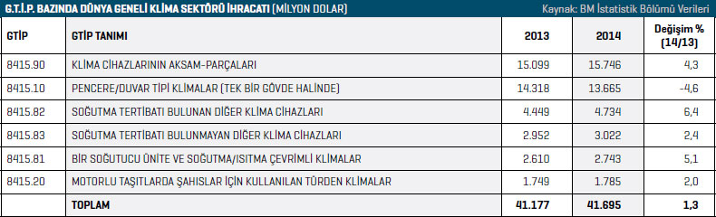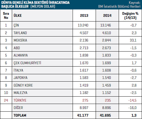 Birleşmiş Milletler (BM) İstatistik Bölümü verilerine göre, 2013 yılında 41,1 milyar dolar olan dünya geneli klima sektörü ihracatı, 2014 yılında yüzde 1,3 artarak 41,6 milyar dolar seviyesine yükseldi. İhracat listesinin ilk sırasında bulunan Çin, 2014 yılında 13,1 milyar dolar değerinde klima ihraç etti. 2013 yılında bu rakam 13,2 milyar dolar seviyesindeydi. Çin’in klima sektörü ihracatı ise yüzde 0,7 azaldı. Listenin ikinci sırasındaki Tayland 2013 yılında 4,5 milyar dolar değerinde klima ihraç ederken, 2014 yılında bu rakam yüzde 2,3 artarak 4,6 milyar dolar olarak kayda geçti. En fazla klima ihraç eden ilk 10 ülke listesinin üçüncü sırasındaki Meksika 2014 yılında 2,8 milyar dolar değerinde ihracat gerçekleştirdi. 2013 yılında Meksika’nın klima sektörü ihracatı 2,1 milyar dolar seviyesindeydi. Meksika’nın klima sektörü ihracatı 2014 yılında yüzde 33,1 arttı. Türkiye, dünya geneli klima ihracatı listesinin 24. sırasında yer alıyor. 2013 yılında 275 milyon dolar değerinde klima ihraç eden Türkiye’nin ihracatı, 2014 yılında yüzde 14,5 azalarak 235 milyon dolar oldu. En fazla klima ihraç eden ilk 10 ülke listesinde, 2013 yılına göre ihracatını en fazla artıran ülke ise yüzde 33,1 ile Meksika oldu.