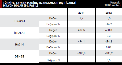 yükseldi. Türkiye’nin en fazla ihraç ettiği ürünler listesinin ikinci sırasında bulunan bulaşık, şişe vb. yıkama ve kurutma makineleri, şişe, kutu çuval vb doldurma, etiketleme makineleri kaleminde ise 2012 yılında Tayvan’a yapılan ihracatın değeri 752 bin dolar oldu.