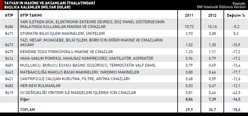için diğer makine ve cihazların aksamı ürün grubunda 2011 yılında 1,52 milyar dolarlık ithalat gerçekleştirilirken bu rakam 2012 yılında yüzde 10,9 ile 1,35 milyar dolara geriledi. Otomatik bilgi işlem makineleri, üniteleri Tayvan’ın 2012 yılında yüzde 5,2 ile en fazla ithal ettiği kalem oldu.
