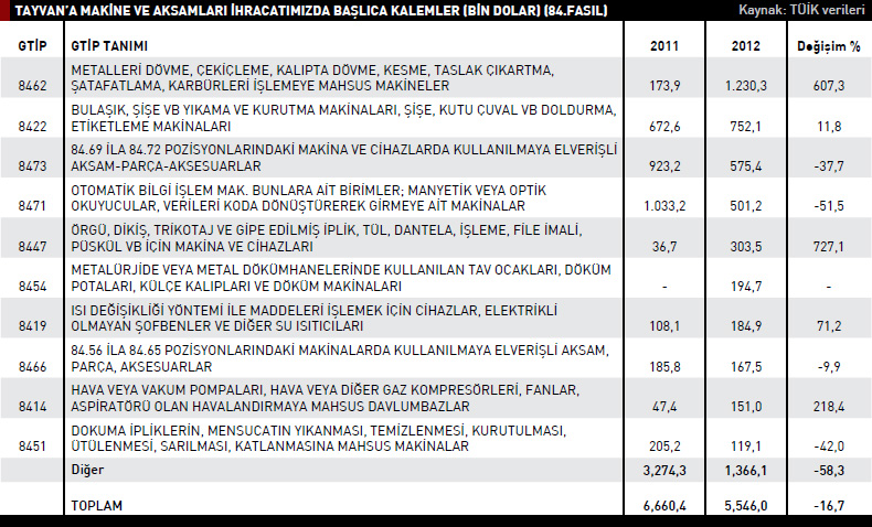 Tayvan’ın 2012 yılında makine ve aksamları ihracatını en fazla artırdığı ülke yüzde 25,5 ile Tayland oldu. Tayland’a 2011 yılında 800 milyon dolar değerinde ürün ihraç edilirken bu rakam 2012 yılında 1,03 milyar dolara yükseldi. Tayvan’ın Türkiye’ye gerçekleştirdiği makine ve aksamları ihracatı 2012 yılında bir önceki yıla göre yüzde 0,3 artarak 489 milyon dolara yükseldi. 2011 yılında Tayvan’ın Türkiye’ye gönderdiği ürünlerin değeri 487 milyon dolardı. Türkiye Tayvan’ın en fazla ihracat gerçekleştirdiği ülkeler listesinde 15. Sırada yer aldı. Tayvan’ın 84. fasılda en fazla ihracat gerçekleştirdiği ilk üç ürün grubu sırasıyla; yazı, hesap,muhasebe, bilgi işlem, büro için diğer makine ve cihazların aksamı; otomatik bilgi işlem makineleri, üniteleri ve metal işlemeye mahsusu işleme merkezleri, istasyonlu tezgahlar oldu.Tayvan’ın 2011 yılına oranla en fazla ihraç ettiği kalem yüzde 14,2 artışla metallerin işlenmesine mahsus torna tezgahları oldu. Söz konusu ürün grubunda Tayvan’ın 2012 yılında ihracatı 900 milyon dolar kaydedildi.