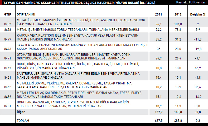 84. fasıl itibarıyla 2012 yılında Türkiye’nin Tayvan’dan en fazla ithal ettiği ürün grubu metal işlemeye mahsus işleme merkezleri, tek istasyonlu tezgahlar ve çok istasyonlu transfer tezgahları oldu. 2011 yılında 96 milyon dolar değerinde ithalat yapılan söz konusu kalemden, 2012 yılında yapılan ithalatın değeri yüzde 9 artışla 104 milyon dolar oldu. İkinci sırada yer alan metal işlemeye mahsus torna tezgahları (tornalama merkezleri dahil) ürün grubunda 2011 yılında 74 milyon dolarlık ithalat gerçekleştirilirken bu rakam 2012 yılında 78 milyon dolar olarak kaydedildi.