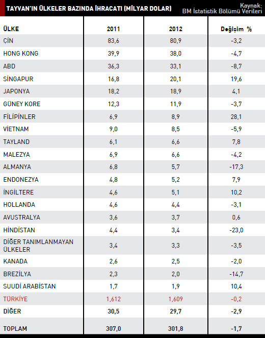Birleşmiş Milletler verilerine göre Tayvan’ın 2012 yılında ihracatı 302 milyar dolar, ithalatı ise 272 milyar dolar oldu. Ülkenin ihracat yaptığı başlıca ülkeler; Çin, Hong Kong, ABD, Singapur, Japonya, Güney Kore, Filipinler olarak sıralanırken; ithalatında ise Japonya, Çin, ABD, Güney Kore, Suudi Arabistan’dır. Türkiye Tayvan’ın ihracatında 24., ithalatında 58. sırada bulunuyor. 2012 yılında ülkenin en fazla ihracat yaptığı ürün grubu 109 milyar dolar ve yüzde 36,1 pay ile 85. fasılda yer alan elektrikli makine ve cihazlar, aksam ve parçalarıdır.