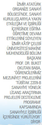 Okullarının, üçüncü kuşak üniversite kavramı uyarınca, “sanayide üniversite” prensibiyle İzmir Atatürk Organize Sanayi Bölgesi’ne bitişik olarak 2010 yılında kurulan bir devlet üniversitesi olduğunu söyleyen İzmir Kâtip Çelebi Üniversitesi Makine Mühendisliği Bölüm Başkanı Prof. Dr. Buket Okutan Baba, bölümlerinin de üniversitenin kuruluşundan iki yıl sonra mühendislik ve mimarlık fakültesi bünyesinde eğitim hayatına başladığını aktarıyor. Eğitim-öğretime başladıkları ilk günden itibaren lisans eğitimini yüzde 100 İngilizce olarak verdiklerini belirten Baba, “Kültürlü, çağdaş, özgüveni yüksek, sosyal yaşamında başarılı ve evrensel değerlere bağlı nesiller yetiştirme gayesinin yanı sıra; analitik düşünebilen, mekanik, termal ve kontrol sistemlerinin optimum dizaynı ve üretimini yapabilen, problemlere çözüm üretebilen ve sorunları yönetebilen, yenilikçi fikir ve ürünler geliştirebilen, girişimci ve mühendislik etiğine sahip makine mühendisleri yetiştirme misyonuyla hareket ediyoruz” diyor.
