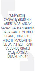 Sanayi kuruluşları, üniversite içindeki bilgi ve kendilerine ait sermayenin bütünleştirilmesi konusunda biraz sabırsız davranıyor. Bununla birlikte kendi iş dinamiklerinin getirdiği sorumlulukla acil çözüm beklentisine giriyor. Sürdürdükleri teknik ve ekonomik faaliyetlerden kısa dönem içinde geri dönüş sağlamak isteyip üniversitelerle yaptıkları işbirliklerinin uzun soluklu araştırma ve geliştirme çalışmaları gerektirdiği gerçeğini göz ardı ediyorlar. Üniversite- sanayi işbirliklerinin artırılması ancak sanayi çalışanlarının daha sabırlı ve bilgi odaklı, üniversite araştırmacılarının ise daha hızlı, ticari ve sonuç odaklı çalışmasıyla mümkündür. Henüz gelişmiş ülkeler düzeyinde olmasa da, üniversitelerde bilgi üretimindeki hızlanma, bilginin ürün/hizmete dönüşmesi ve sanayi sorunlarına çözüm olabilme hızındaki artış ve üniversite araştırmacılarının üniversite-sanayi işbirliği alanındaki deneyimlerinin artması olumlu gelişmelerin kaydedilmesini sağlıyor. Ayrıca KOBİ tanımında yapılan son değişiklikler ikili ilişki ve işbirliklerini hızlandıracak ve daha verimli çalışmalara yön verecektir.