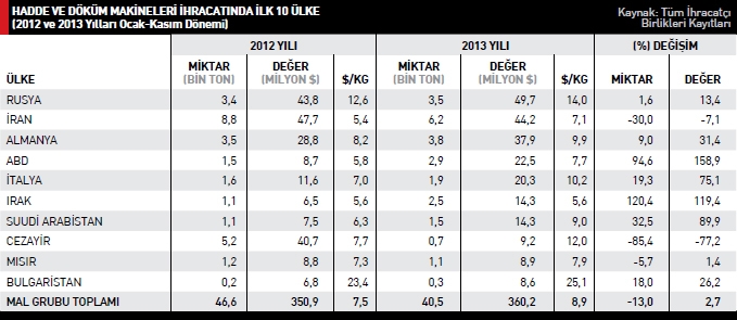 Hadde ve döküm makineleri, kalıplar, aksam ve parçaları sektöründe 2013 yılın Ocak-Kasım döneminde 360,2 milyon dolar değerinde ihracat gerçekleştirildi. 2012 yılının aynı döneminde, söz konusu ürün grubunun ihracatı 350,9 milyon dolardı. Hadde ve döküm makineleri, kalıplar, aksam ve parçaları sektöründe yaşanan ihracat artışı yüzde 2,7 olarak kaydedildi. Hadde ve döküm makineleri, kalıplar, aksam ve parçaları mal grubunda 2013 yılı Ocak-Kasım döneminde en fazla ihracat 49,7 milyon dolarla Rusya’ya gerçekleştirildi. Yüzde 13,4 artışın yaşandığı söz konusu ülkeye 2012 yılının aynı döneminde gönderilen ürünlerin değeri