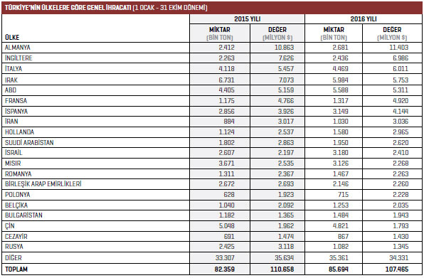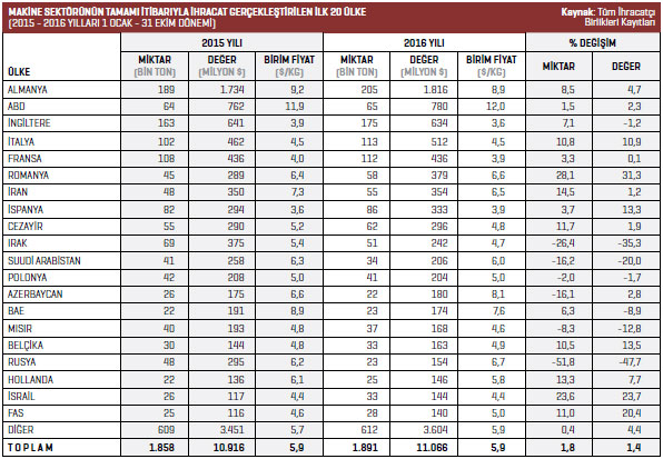 Hadde ve döküm makineleri mal grubunda 2016 yılının Ocak-Ekim döneminde 29,9 milyon dolarla en fazla Almanya’ya ihracat gerçekleştirildi. 2015 yılının aynı döneminde Almanya’ya gönderilen ürünlerin değeri 27,9 milyon dolardı. Söz konusu ülkeye yönelik ihracat artışı yüzde 7 oldu. Listenin ikinci sırasında yer alan İtalya’ya 2015 yılının Ocak-Ekim döneminde 10,4 milyon dolarlık ihracat gerçekleştirilirken 2016 yılının aynı döneminde bu rakam yüzde 62,9 artışla 17 milyon dolar olarak kayda geçti. Üçüncü sıradaki Bulgaristan’a 2016 yılının Ocak-Ekim döneminde 16,7 milyon dolar değerinde ürün ihraç edildi. 2015 yılında bu rakam 6,9 milyon dolardı. Bulgaristan’a yönelik ihracat artışı yüzde 141,6 oldu. Dördüncü sırada bulunan İran’a 2016 yılının Ocak-Ekim döneminde 15,3 milyon dolarlık ihracat gerçekleştirildi.