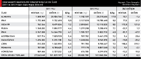 Makine ve aksamları ihracatı 2012 yılı Ocak-Mayıs döneminde yüzde 19,5 oranında artış kaydederek 5 milyar 791 milyon dolar seviyesine ulaştı. Türkiye’nin makine ihracatında ilk on ülke sıralamasında ise Almanya 918 milyon 87 bin dolar ile ilk sırada yer aldı.