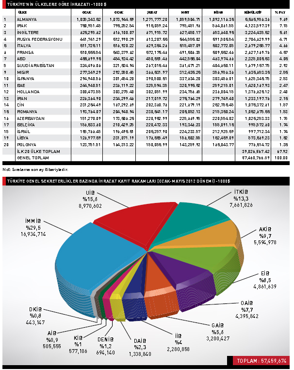 2012 yılının aynı döneminde ise bu rakam 25 milyon 882 bin dolar seviyesine yükseldi. Listenin ikinci sırasında yer alan Irak’a yönelik ihracatımız yüzde 25,3 oranında arttı. 2011 yılının Ocak-Mayıs döneminde 11 milyon 661 bin dolar değerinde ürün gönderilen Irak’a 2012 yılının aynı döneminde yapılan ihracat 14 milyon 617 bin dolar seviyesine ulaştı.