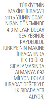 2015 yılı Ocak-Nisan döneminde Türkiye’nin makine ihracatı 4,3 milyar dolar olarak kaydedildi. 2015 yılı Ocak-Nisan dönemi rakamlarına göre Almanya, 692 milyon dolar ile makine sektöründe en fazla ihracat gerçekleştirilen ilk 10 ülke listesinin ilk sırasında yer alıyor. Listenin ikinci sırasındaki ABD’ye yönelik makine ihracatı, 2014 yılı Ocak-Nisan döneminde 303 milyon dolarken 2015 yılının aynı döneminde bu rakam yüzde 2 artışla 309 milyon dolar oldu. Türkiye’nin en fazla makine ihracatı gerçekleştirdiği ilk 10 ülke listesinin üçüncü sırasında ise İngiltere bulunuyor. İngiltere’ye yönelik makine ihracatımız 2015 yılı Ocak-Nisan döneminde 246 milyon dolar oldu.