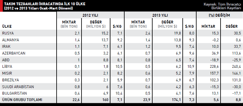 2012 yılının Ocak- Mart döneminde 160 milyon dolar olan takım tezgahları ihracatı, 2013 yılının aynı döneminde yüzde 8,8 artarak 174,1 milyon dolar seviyesine yükseldi. Takım tezgahları ürün grubunda en fazla ihracat gerçekleştirilen ülke, 2012 yılının Ocak-Mart dönemine göre yüzde 30,5 artışla 2013 yılının aynı döneminde 19,8 milyon dolarlık ürün ihraç ettiğimiz Rusya oldu. Rusya’ya 2012 yılının Ocak-Mart döneminde gönderilen ürünlerin değeri 15,2 milyon dolardı. İkinci sırada yer alan Almanya’ya yönelik takım tezgahları ihracatı yüzde 0,6 artışla 2013 yılının Ocak-Mart döneminde 13,8 milyon dolar oldu. 2012 yılının aynı döneminde Almanya’ya 13,7 milyon dolarlık ürün ihraç edilmişti. Listenin üçüncü sırasında bulunan Irak’a 2012 yılının Ocak-Mart döneminde 7,1 milyon dolar değerinde ihracat gerçekleştirildi. 2013 yılının aynı döneminde bu rakam yüzde 33,7 artışla 9,5 milyon dolar oldu. Dördüncü sırada yer alan Azerbaycan’a yüzde 113,6 artışla 2013 yılının Ocak-Mart döneminde 6,9 milyon dolar değerinde ürün ihraç edildi. 2012 yılının aynı döneminde söz konusu ülkeye gönderilen ürünlerin ihracat değeri 3,2 milyon dolardı. Listenin beşinci sırasındaki ABD’ye 2013 yılının Ocak-Mart döneminde takım tezgahları ürün grubu ihracatı 6,5 milyon dolar olarak kayda geçti.