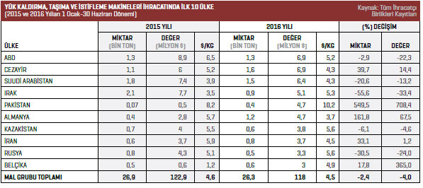 Yük kaldırma, taşıma ve istifleme makineleri ürün grubunda 2016 yılının Ocak-Haziran döneminde 6,9 milyon dolarla en fazla ABD’ye ihracat gerçekleştirildi. Listenin ikinci sırasında bulunan Cezayir’e 2015 yılının Ocak- Haziran döneminde 6 milyon dolarlık ihracat gerçekleştirilirken 2016 yılının aynı döneminde bu rakam yüzde 14,4 artışla 6,9 milyon dolar oldu. Listenin üçüncü sırasında bulunan Suudi Arabistan’a 2016 yılının Ocak-Haziran döneminde 6,4 milyon dolarlık ihracat gerçekleştirildi. Dördüncü sırada yer alan Irak’a 2016 yılının Ocak-Haziran döneminde ihraç edilen yük kaldırma, taşıma ve istifleme makinelerinin değeri 5,1 milyon dolar oldu. Listenin beşinci sırasındaki Pakistan’a 2015 yılının Ocak-Haziran döneminde ihraç edilen yük kaldırma, taşıma ve istifleme makinelerinin değeri 584 bin dolarken 2016 yılının aynı döneminde bu rakam yüzde 708,4 artışla 4,7 milyon dolar olarak kaydedildi.