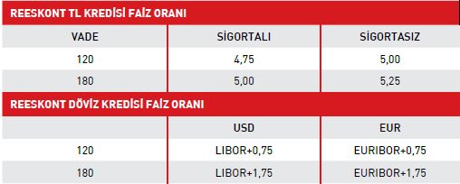 Piyasaya göre uygun faiz yapısı ve kolay erişilebilirlik niteliği taşıyan Reeskont Kredisi, Türkiye Cumhuriyet Merkez Bankası’nın (TCMB) Eximbank’a tanıdığı 5,5 milyar dolarlık limit çerçevesinde ihracatçılara sunuluyor. Kredi, imalatçı ve ihracatçı firmaların sevk öncesi finansman ihtiyaçlarının karşılanması amacıyla, vadesine en fazla 120/180 gün kalmış ticari bankaların avalini taşıyan bonoların TCMB reeskontuna sunulması suretiyle yürütülüyor. Program kapsamında firma limiti ise 90 milyon dolar olarak belirlendi. Tüm ihracatçılara açık olan Reeskont Kredisi’nden yararlanmak isteyen firmaların teminat olarak kendisinin borçlu, Eximbank’ın alacaklı olarak yer aldığı ve ticari bir bankanın avalini taşıyan bono düzenlemeleri gerekiyor. Türk Eximbank kredi programları içinde sadece bu program ilave bir teminat maliyeti ortaya