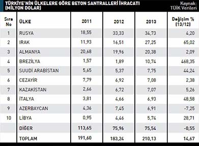 Türkiye’nin beton santralleri ihracatı 2013 yılında, bir önceki yıla oranla yüzde 14,6 artarak 210 milyon dolara çıktı. 2012 yılında bu rakam 183 milyon dolar düzeyindeydi. Türkiye 2013 yılında beton santralleri sektöründe en fazla Rusya’ya ihracat gerçekleştirdi. 2012 yılında söz konusu ülkeye 33,3 milyon dolarlık ihracat gerçekleştirilirken bu rakam, 2013 yılında yüzde 4,20 artışla 34,7 milyon dolar seviyesine yükseldi. Listenin ikinci sırasında ise Irak bulunuyor. Türkiye’nin Irak’a yönelik beton santralleri ihracatı 2013 yılında 27,2 milyon dolar oldu. 2012 yılında bu rakam 16,5 milyon dolardı. I