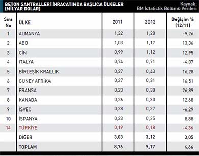 Birleşmiş Milletler (BM) İstatistik Bölümü verilerine göre, 2011 yılında 8,76 milyar dolar olan beton santralleri ihracatı, 2012 yılında yüzde 4,6 artarak 9,17 milyar dolar seviyesine yükseldi. İhracat listesinin ilk sırasında bulunan Almanya, 2011 yılında 1,32 milyar dolar değerinde beton santrali ihraç ederken bu rakam, 2012 yılında yüzde 9,2 azalarak 1,20 milyar dolar olarak kaydedildi. Listenin ikinci sırasındaki ABD 2012 yılında 1,17 milyar dolar değerinde beton santrali ihraç etti. 2011 yılında ABD’nin ihraç ettiği beton santralleri değeri 1 milyar dolar seviyesindeydi. ABD’nin 2012 yılı beton santralleri ihracatı bir önceki yıla göre yüzde 13,3 artış gösterdi. En fazla beton santrali ihraç eden ilk 10 ülke listesinin üçüncü sırasındaki Çin 2011 yılında 990 milyon dolarlık beton santrali ihraç ederken bu rakam, 2012 yılında yüzde 12,9 artarak 1,12 milyar dolar olarak kayda geçti. Türkiye, dünya geneli beton santralleri ihracatında 14. sırada yer alıyor. 2011 yılında 190 milyon dolar seviyesinde beton santrali ihraç eden Türkiye, 2012 yılında 180 milyon dolarlık ihracat gerçekleştirdi. Türkiye’nin beton santralleri ihracatı 2011-2012 yılları arasında yüzde 4,36 oranında azaldı. En fazla beton santrali