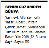 Albert Einstein, “İnsanın gerçek değeri, kendi kendisinden özgürleşmeyi ne ölçüde ve ne anlamda becerebildiğiyle belirlenir” diyordu. Benim Gözümden Dünya başlıklı kitabında ise Einstein’ın hayata, yaşadığı dünyaya ve bilimsel çalışmalarına dair görüşlerini okuyabiliyoruz: Büyüleyici, esprili ve zekice gözlemler; büyük bir kalbi ve az rastlanır bir aklı açığa vuran samimi itiraflar...