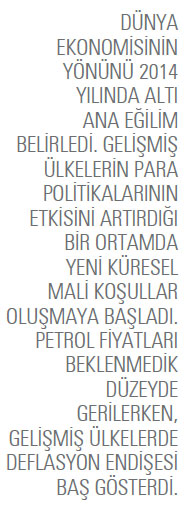 Küresel kriz sonrası olağan üstü genişletici para politikaları ile tarihin en düşük faiz oranlarını uygulayan gelişmiş ülkelerin Merkez Bankalarının 2014 yılı politikaları küresel ekonomide belirleyici oldu. ABD Merkez Bankası (FED) 2013 yılı Aralık ayında başlattığı parasal genişlemeden çıkışı, 2014 yılı Ekim ayında sona erdirdi. Ardından FED’in olağanüstü düşük faiz oranlarını artırma sürecine yaşandı. ABD Merkez Bankasının para politikasındaki bu normalleşme yeni küresel mali koşullar oluşturmaya başladı. Avrupa Merkez Bankası ise 2014 yılında yeni parasal genişleme önlemleri aldı. Özellikle karşı karşıya kalınan deflasyon riski nedeniyle Avrupa Merkez Bankası devlet tahvillerini de satın almaya yönelik yeni programı ile büyümeyi de destekledi. İngiltere ve Japonya Merkez Bankaları da genişletici para politikalarını ve tarihi düşük faiz oranlarını yıl boyunca korudu ve uyguladı.