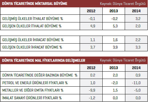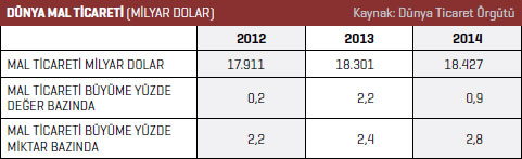Dünya mal ticareti son üç yıldır önemli bir yavaşlama içindedir. Dünya mal ticareti değer olarak 2012 yılında yüzde 0,2 ve 2013 yılında yüzde 2,2’den sonra 2014 yılında sadece yüzde 0,9 büyüyebildi. Dünya mal ticaretinde miktarsal olarak büyüme de çok sınırlı gerçekleşti. Dünya mal ticareti miktarsal olarak 2012 yılında yüzde 2,2, 2013 yılında yüzde 2,4, 2014 yılında yüzde 2,8 büyüdü. Dünya mal ticareti bu zayıf büyüme performansına bağlı olarak 2012 yılında 17,91 trilyon dolar, 2013 yılında 18,3 trilyon dolar ve 2014 yılında ise 18,43 trilyon dolar olarak gerçekleşti. 2014 yılında miktarsal olarak ithalat ve ihracatta gelişmiş ve gelişen ülkelerde önemli gelişmeler yaşandı. Gelişmiş ülkelerde ithalat 2012 ve 2013 yıllarında küçüldükten sonra 2014 yılında yüzde 3,2 ile göreceli bir artış gösterdi. Buna karşın gelişen ülkelerin ithalat artışı yavaşladı. 2012 yılında yüzde 4,9 ve 2013 yılında yüzde 5,3 oranında artan gelişen ülkelerin ithalatı miktarsal bazda 2014 yılında sadece yüzde 2 genişledi.
