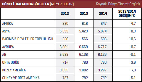2014 yılında yüzde 0,7 büyüyerek 6,72 trilyon dolarlık hacme ulaştı. Asya bölgesi 2014 yılında yüzde 8,3 ile ithalatını en çok artıran bölge oldu ve 5,87 trilyon dolar pazar hacmi ile AB pazar büyüklüğüne oldukça yaklaştı. Kuzey Amerika pazarında da ithalat 2014 yılında yüzde 7 ile ortalamanın üzerinde arttı ve 3,3 trilyon dolarlık ithalat gerçekleşti. Ortadoğu ve Afrika bölgelerinin ithalatı bu bölgelerin ihracat gelirlerinin düşmesine rağmen 2014 yılında yüzde 3,9 ve 4,7 oranında büyüdü. 2014 yılında iki bölgenin ithalatı daraldı. Bağımsız Devletler Topluluğunun ithalatı yüzde 10,6 geriledi. Uygulanan yaptırımlarda gerilemede etkili oldu. Güney ve Orta Amerika bölgesinde ithalat yüzde 5,1 düştü. Bu iki bölgede enerji ve emtia ihraç gelirlerinin düşmesine bağlı olarak ithalatlar da geriledi. Bölgelerdeki ekonomik yavaşlama gerilemeyi etkileyen ana unsurdur.