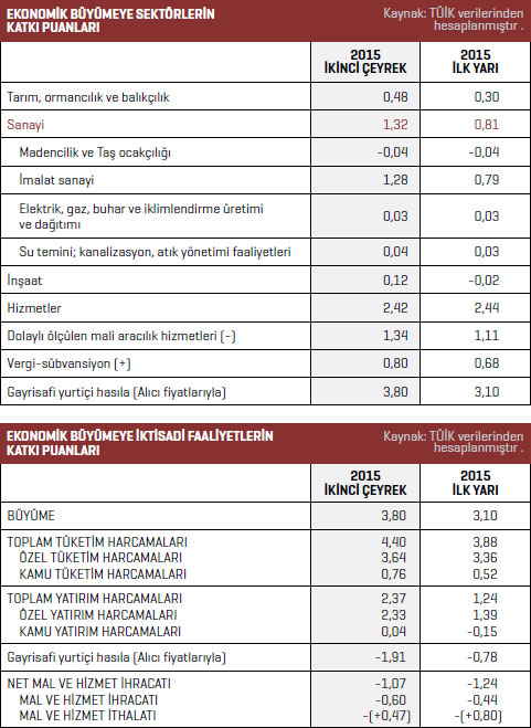İktisadi faaliyetlerin ekonomik büyümeye katkısı ise yatırımların konumu itibariyle makine sanayisi için belirleyici oldu. 2015 yılının ilk yarısında yüzde 3,10 olarak gerçekleşen büyümenin 3,88 puanı tüketim harcamalarından geldi. Toplam yatırım harcamalarının büyümeye katkısı 1,24 puan olarak belirlendi. Özel sektör yatırımları büyümeyi pozitif, kamu yatırımları ise negatif yönde etkiledi. Stok değişimi ile net mal ve hizmet ihracatı ise yılın ilk yarısında büyümeye 0,78 ve 1,24 puan negatif yönde yansıdı. Büyümenin yapısı değerlendirildiğinde ekonominin halen önemli ölçüde iç tüketime dayalı olarak büyümekte olduğu gözleniyor. Ekonomide yatırımların etkisi sınırlı kalırken, net ihracatın etkisi negatifte kaldı. Bu nedenle büyümenin kalitesi halen çok sağlıklı değildir. Bununla birlikte özel sektör yatırımlarında ikinci çeyrekte daha yüksek bir büyüme yaşandığı görülüyor. Özel sektör yatırımları 3,80 p