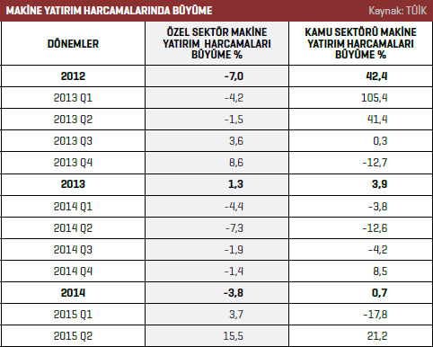 Makine sanayi için özel sektör yatırımları içinde makine yatırımları daha önemli bir göstergedir. Nitekim özel sektör yatırımları makine ve ekipman harcamaları ile inşaat harcamalarından oluşmaktadır. Özel sektör makine yatırım harcamaları 2012 yılında yüzde 7 küçüldü, 2013 yılında yüzde 1,3 büyüdü, 2014 yılında ise yeniden yüzde 3,8 küçüldü. 2015 yılında ise özel sektör makine yatırım harcamaları daha hızlı büyüyor. Özellikle ikinci çeyrekte yüzde 15,5 büyüme dikkat çekiyor. Son üç senedir hiç büyümeyen özel sektör makine yatırım harcamalarının 2015 yılında daha çok yenileme ve modernizasyon amaçlı arttığı gözleniyor.
