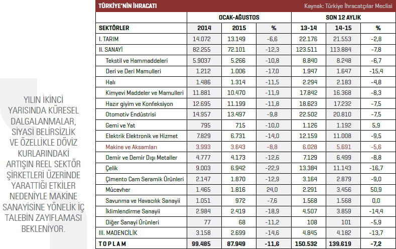 küresel krizden sonraki en hızlı ekonomik büyümesini göstermesi bekleniyor. ABD ve AB ekonomilerindeki büyümenin diğer gelişmiş ülkeleri de olumlu etkileyeceği tahmin ediliyor. Gelişen ülkelerde ise ekonomik büyüme üç nedenden dolayı zayıflıyor. Bu nedenlerden ilki ABD Merkez Bankası FED’in para politikasındaki normalleşme ile ortaya çıkan yeni küresel mali koşulların yarattığı etkilerdir. Gelişen ülkelerden önemli sermaye çıkışı yaşanıyor ve gelişen ülkelerin para birimleri değer kaybediyor. İkinci neden düşen enerji ve emtia fiyatları nedeniyle bu ürünleri ihraç eden gelişen ülkelerin ihracat gelirlerinin azalmasıdır. Üçüncü neden işe Çin ekonomisindeki yavaşlamadır. Çin ile önemli ticaret bağları bulunan gelişen ülkelerde büyüme Çin etkisi ile yavaşlıyor. Gelişen ülkelerde gözlenen ekonomik yavaşlama, yatırımları ve makine talebini de olumsuz etkiliyor. Bu çerçevede değerlendirildiğinde 2015 yılının ilk yarısında küresel makine talebi gelişmiş ülkelerden artarken, gelişen ülkelerden azaldı. Yılın ikinci yarısında da benzer eğilim sürecektir. Türkiye’nin genel ihracatı ile birlikte makine ihracatı da küresel talep koşullarından olumsuz etkileniyor. Nitekim Türkiye’nin yılın ilk sekiz ayında toplam ihracatı yüzde 11,6 ve makine ihracatı ise yüzde 8,8 geriledi.