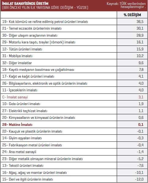 e yukarı yönlü revize edilen yüzde 2,5 büyümesinin ardından yılın ikinci çeyreğinde beklentilerin üzerine çıkarak yüzde 3,8 büyüme gösterdi. Böylece yılın ilk yarısında büyüme oranı yüzde 3,1 olarak gerçekleşti. Ekonomik büyümenin makine sanayisine yönelik talep etkisini değerlendirmek için ana sektörlerin ve iktisadi faaliyetlerin gelişimi ile ekonomik büyümeye katkıları önemlidir. Sektörlerin ekonomik büyümeye katkıları değerlendirildiğinde makine sanayisi için önem taşıyan ana sektörler imalat, madencilik, enerji, inşaat ve tarımdır. İmalat sanayinin yılın ilk yarısında büyümeye katkısı 0,79 puan oldu. Madencilik ve taş ocakçılığı sektörünün katkısı negatif seyir izledi. Elektrik, gaz, buhar ve iklimlendirme ile su temini alt sektörlerinin katkısı ise çok sınırlı kaldı. İnşaat sektörü de yılın ilk yarısında yüzde 0,3 küçülürke