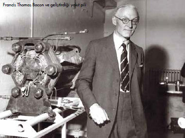 Yakıt pillerinin bundan sonraki gelişiminde ise Cambridge Üniversitesi’nden Dr. Francis Thomas Bacon’ın önemli katkılar yaptığı görülür. 1932’de ‘Bacon Cell’ adını verdiği ilk alkalin yakıt pilini üreten Bacon, 1959 yılında hidrojen ve hava ile çalışan ilk yakıt pilini geliştirir.5 kilowatt’lık bu sistem bir kaynak makinesini çalıştırmaya yetecek güçtedir. Bir yıl sonra ise tarım aletleri üreticisi Allis-Chalmers’da çalışan bir mühendisi olan Harry Karl Ihrig, yakıt piliyle çalışan ilk vasıtayı tanıtır. Çok sayıda yakıt pilini kombine ederek 20 beygir gücündeki bir traktörü çalıştırmayı ba- şaran Ihrig, bugün bildiğimiz anlamdaki yakıt pillerinin ticarileşmesine zemin hazırlamış olur.