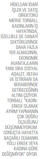 Kendi deyişiyle “Emekçi bir mühendis babanın kızı” olan Merve Torbalı, lisans eğitimini siyasal bilimler alanında tamamlamasına rağmen babası Salih Torbalı’ya destek olmak için Hidelsan’da çalışmaya karar vermiş. “Aslında üniversite sonrası hemen iş hayatına atılmak istemedim, ailem de benim kararıma saygı gösteriyordu. Ancak babamın makine aşkı, benim de duygusal bir karar vermemde etkili oldu ve babama ben de destek olmak istedim” diyen Merve Torbalı, verdiği kararın doğruluğunu ise “Üretmenin hazzı ve sanayici olmanın verdiği gurur, bana iyi ki böyle bir karar vermişim dedirtiyor” sözleriyle özetliyor. Erkek egemen bir sektörde çalışıyor olmanın zorluklarını hemen hemen hiç yaşamadığını da dile getiren Merve Torbalı, “İşinizi biliyorsanız ve ukalalık yapmadan mütevazı bir şekilde bunu karşı tarafa hissettiriyorsanız, sarışın olmanızla ya da cinsiyetinizle ilgilenilmiyor, aksine cinsiyet farkı olmaksızın size saygı duyuluyor” derken, kadınların detaycılığı, empati yeteneğinin yüksek olması ve çok yönlü düşünebilmesi nedeniyle erkeklere göre avantajlı konumda olduğunun altını çiziyor.